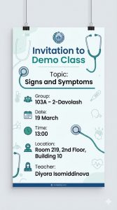Invitation to Demo Class 26/03/202626/03/2026 1-son O'zbek va xorijiy tillar kafedrasi Topic : Signs and symptoms Group: 103A-2-davolash Date: March 19 Time: 13:00 Location: Room 219, 2nd floor, building 10 Teacher: Diyora Isomiddinova